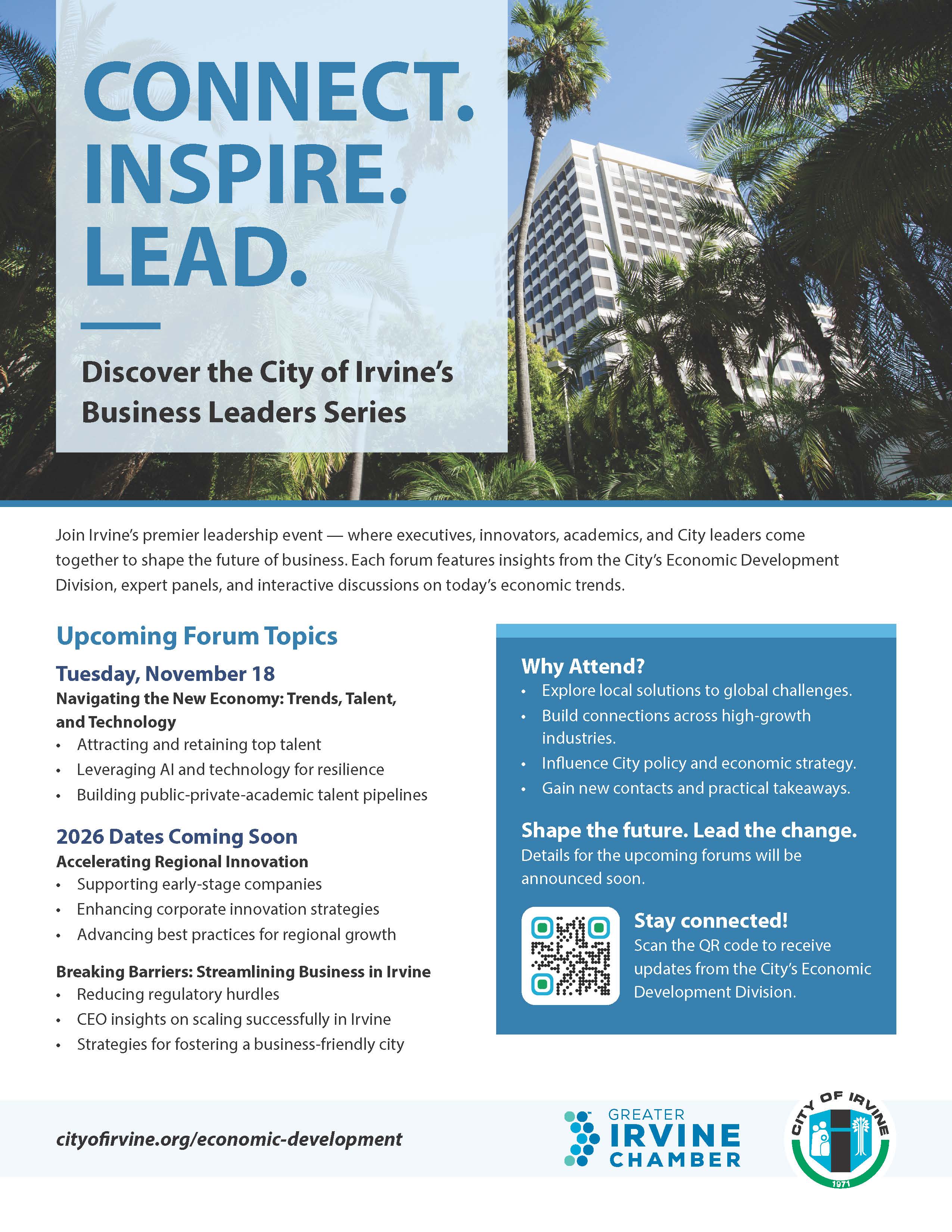 Join Irvine’s premier leadership event — where executives, innovators, academics, and City leaders come together to shape the future of business. Each forum features insights from the City’s Economic Development Division, expert panels, and interactive discussions on today’s economic trends.