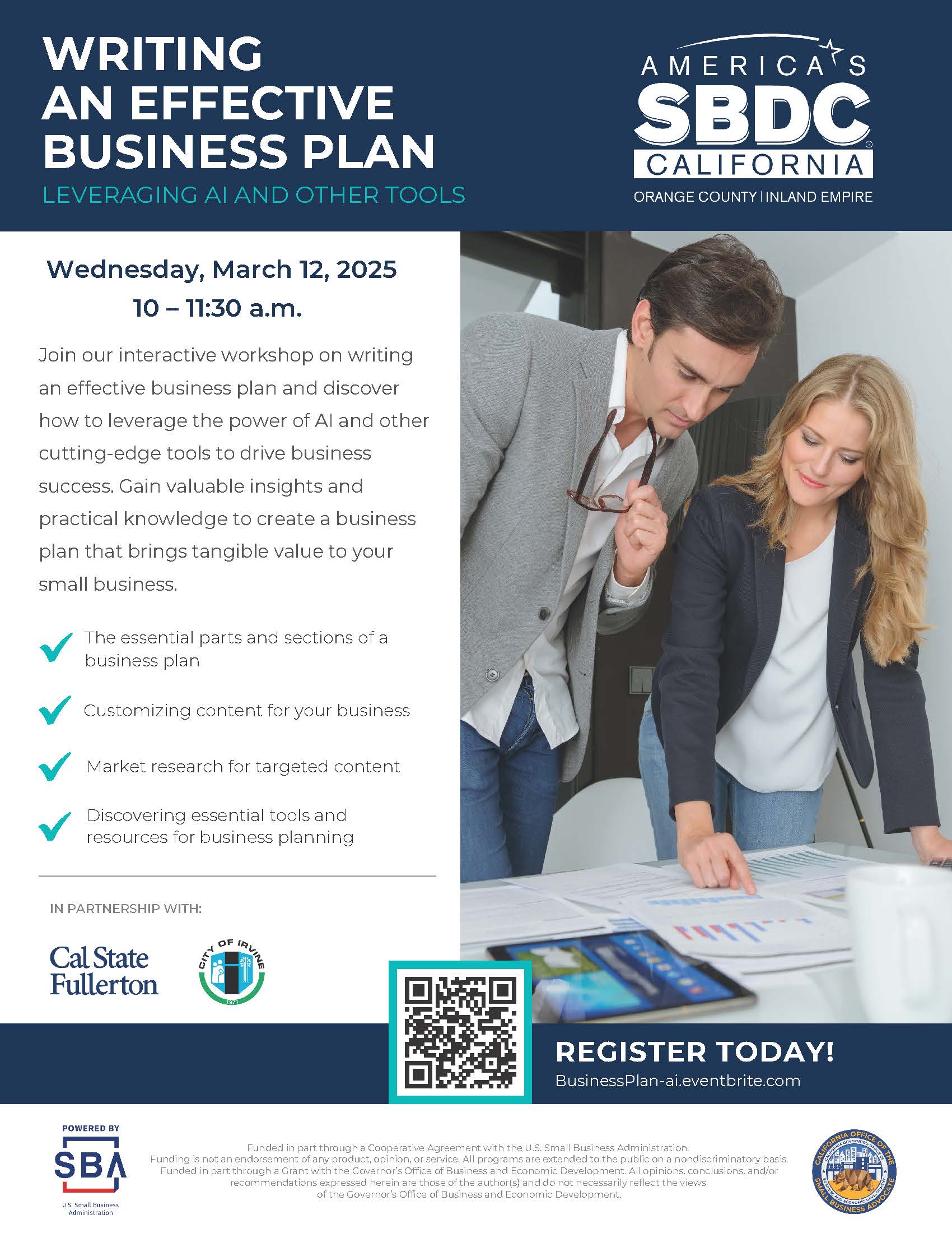 The City of Irvine, through the Irvine Recovery Plan, provided funding for organizations to develop training and grant programs for businesses impacted by COVID-19. Click on the fliers below to explore these opportunities.