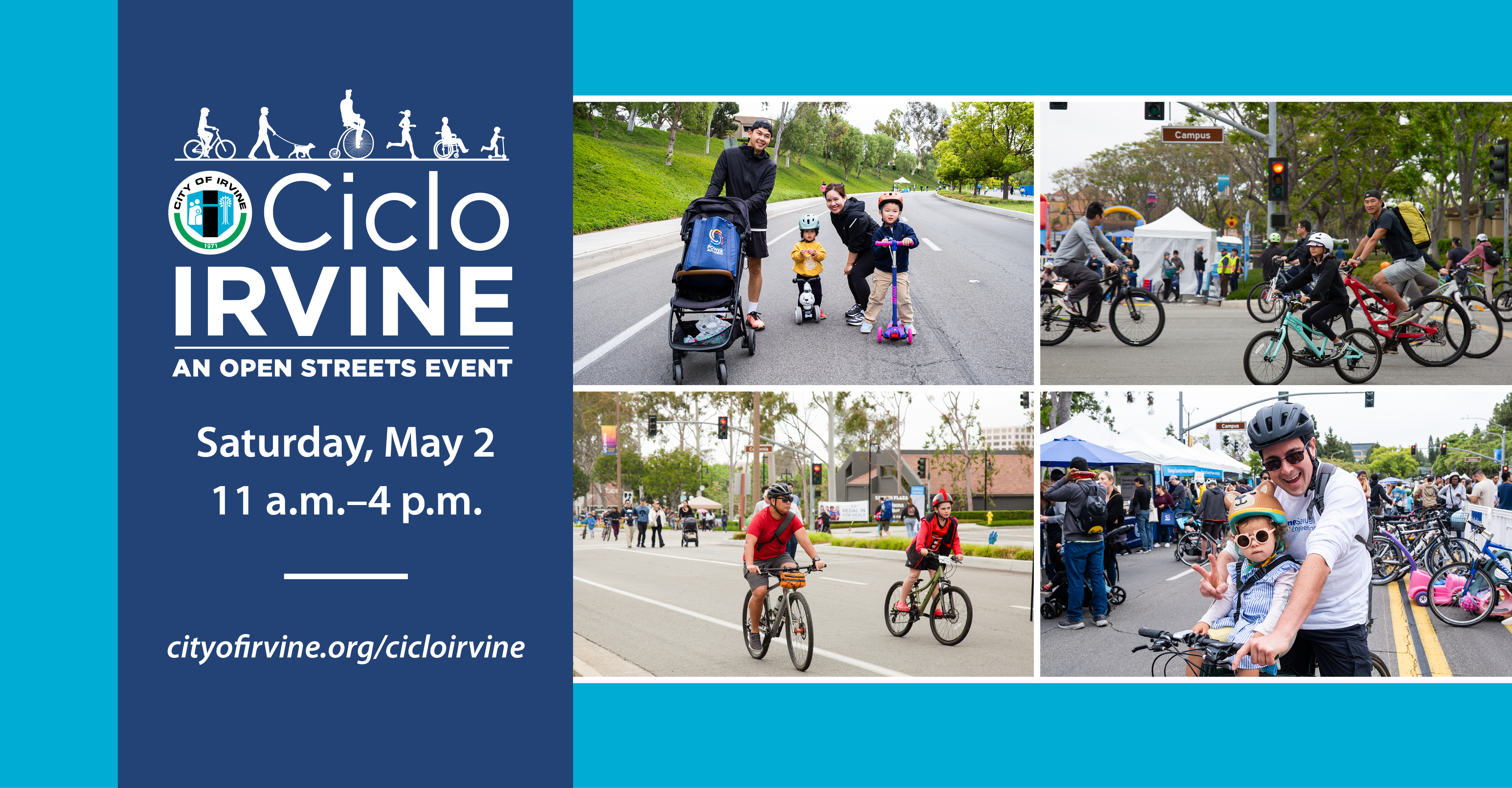 The City of Irvine is excited to celebrate community, connection, and clean air through its third annual car-free open streets event, CicloIrvine, from 11 a.m. to 4 p.m. Saturday, May 2. Residents, visitors, and businesses are invited to stroll, bike, and roll along a 1.3-mile car-free stretch of Irvine Boulevard between Culver Drive and Parkwood.