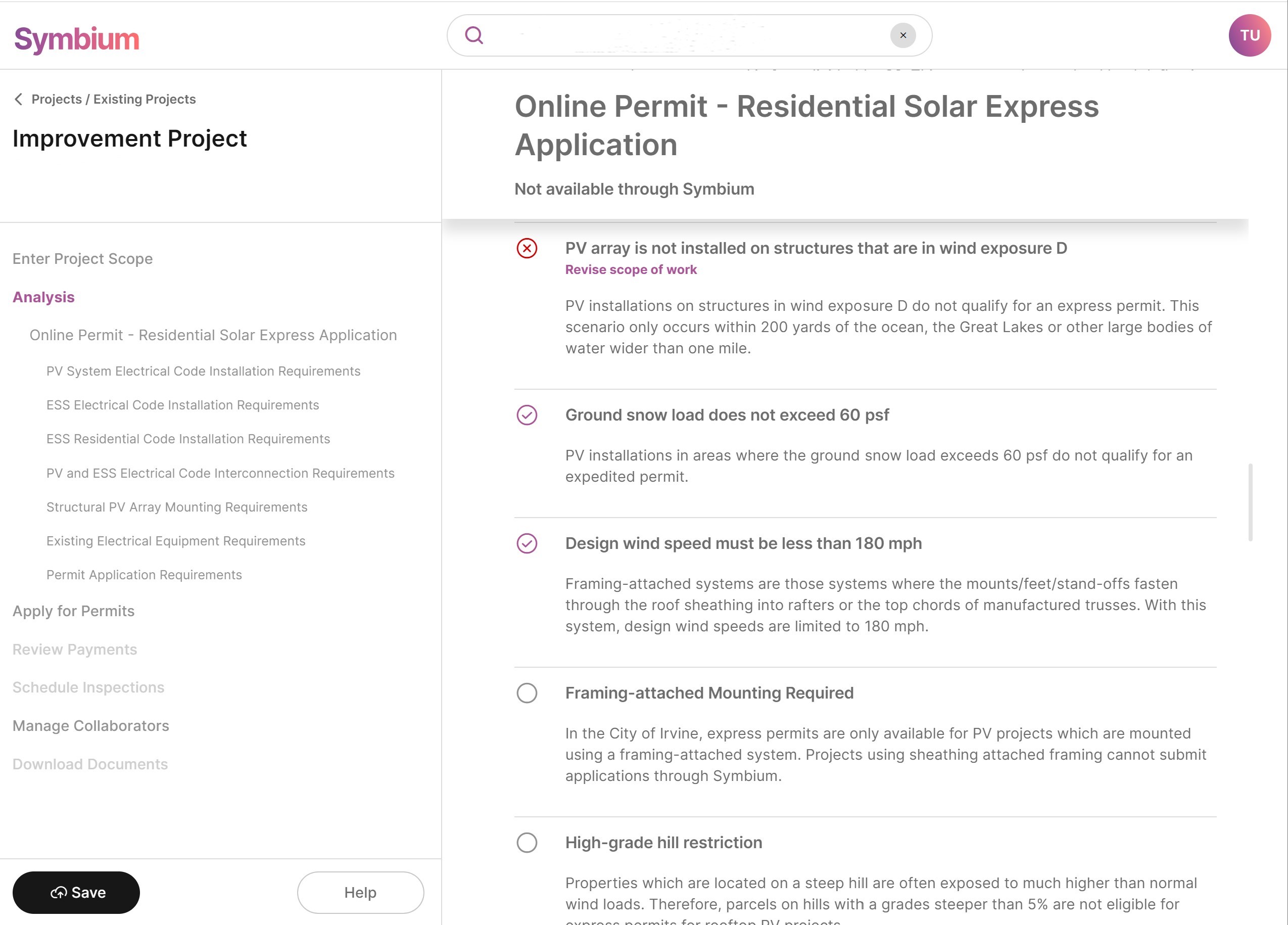 Review the analysis provided. Symbium will instantly check for compliance with State and local regulations and provide a detailed analysis of whether the project meets code requirements.