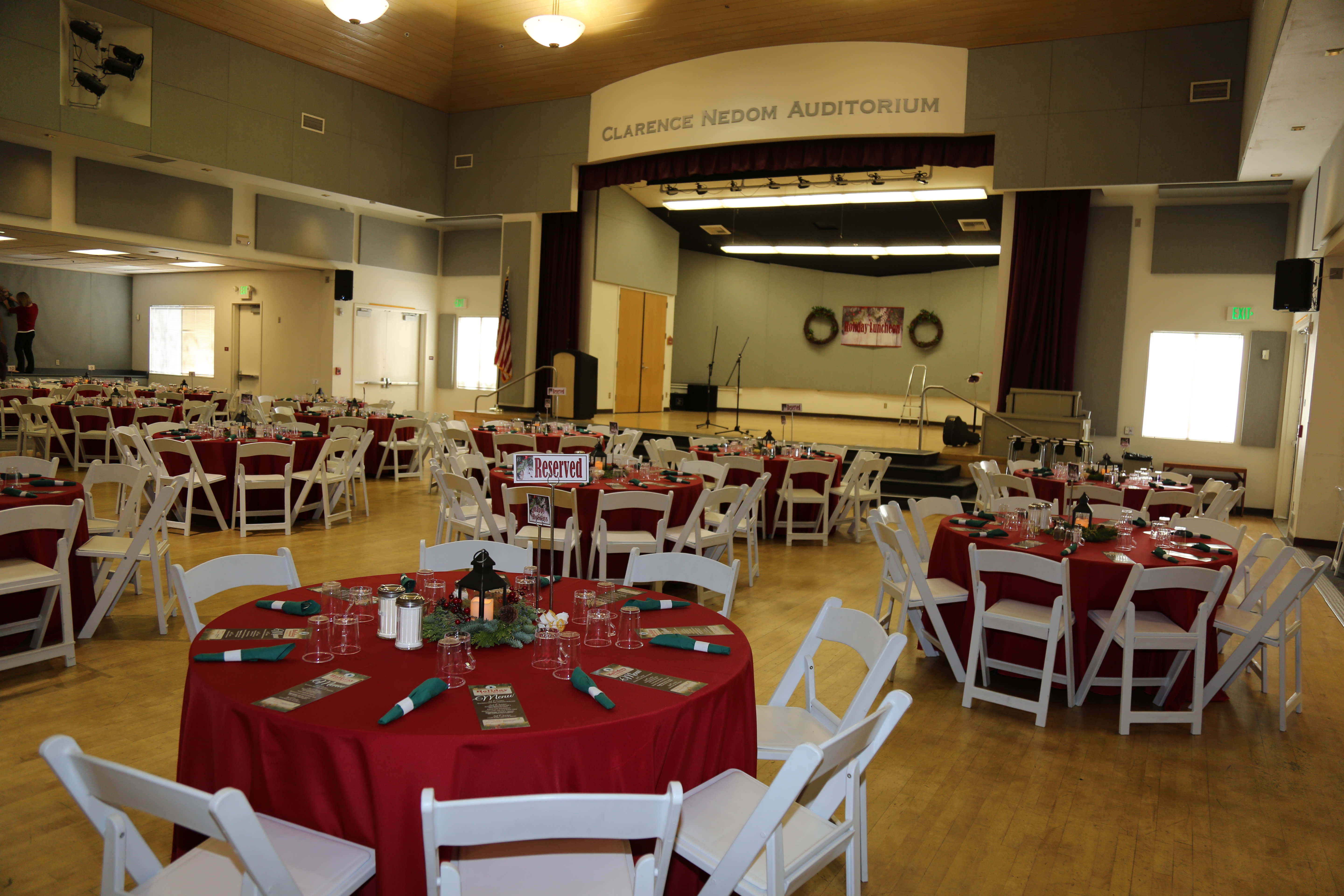 The Clarence Nedom Auditorium is a 1,938-square-foot room with wood flooring. It can accommodate banquet- and theater-style seating, with options for a dance area. Room capacity ranges from 100 to 160 attendees, depending on setup. Additional wings of the room can open up to expand the auditorium to 3,078 square feet, increasing capacity to 200 to 260 people, depending on setup.